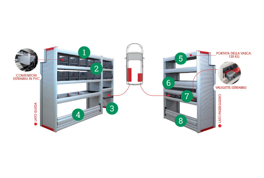 Allestimento completo di pianale in legno multistrato fenolico da 12mm, con tazze fermacarico in inox e rivestimento laterale in polipropilene alveolare resistente agli urti.