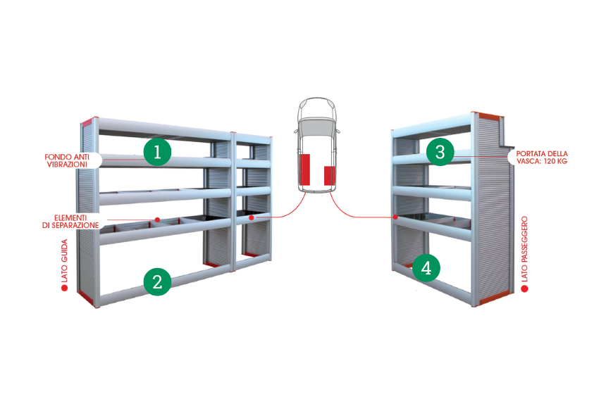 Allestimento completo di pianale in legno multistrato fenolico da 12mm, con tazze fermacarico in inox e rivestimento laterale in polipropilene alveolare resistente agli urti.