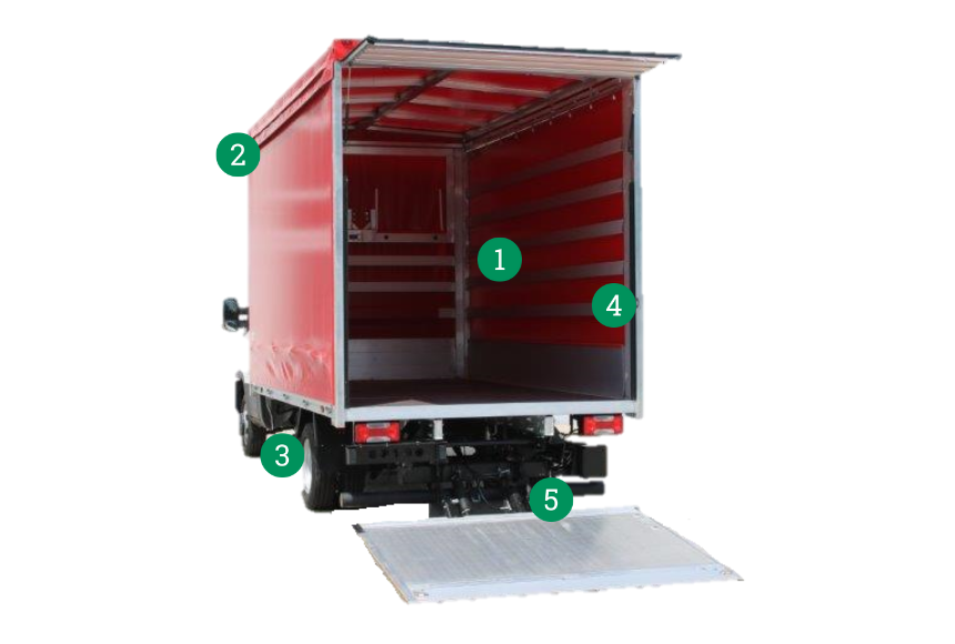 - Cassone in lega leggera di alluminio con piano di carico in legno multistrato antisdrucciolo. Capacità 8 europallets. Portata indicativa 900Kg