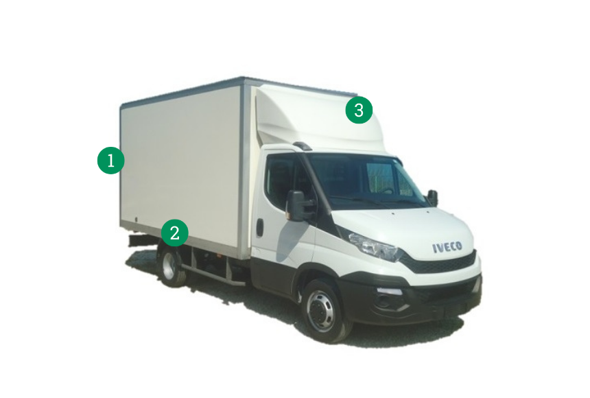 - Furgonatura in alluminio leggero con rivestimento interno in multistrato marino ruvido. Capacità 8 europallets. Portata indicativa 1150Kg