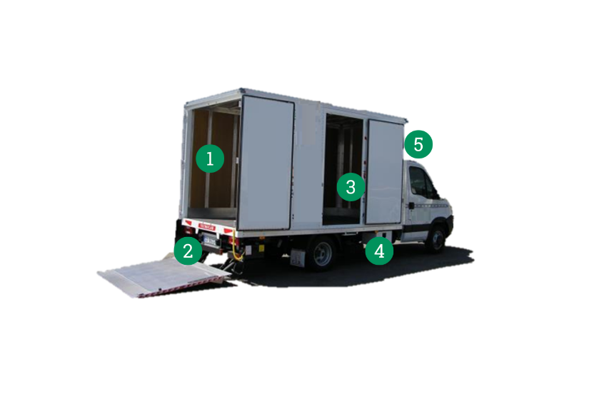 - Porta laterale per permettere l’ingresso nel mezzo in caso di malfunzionamento della sponda e per questioni di sicurezza per le attività lato marciapiede.
