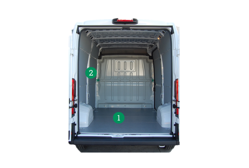 1. Pianale in compensato fenolico in betulla sagomato su misura con spessore 9 mm. con profilo in alluminio in corrispondenza delle porte, impermeabile e resistente ad oli e acidi.  Consente il mantenimento del vano in condizioni di ordine e pulizia, facilitando inoltre il lavaggio.