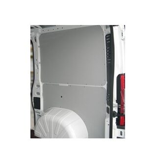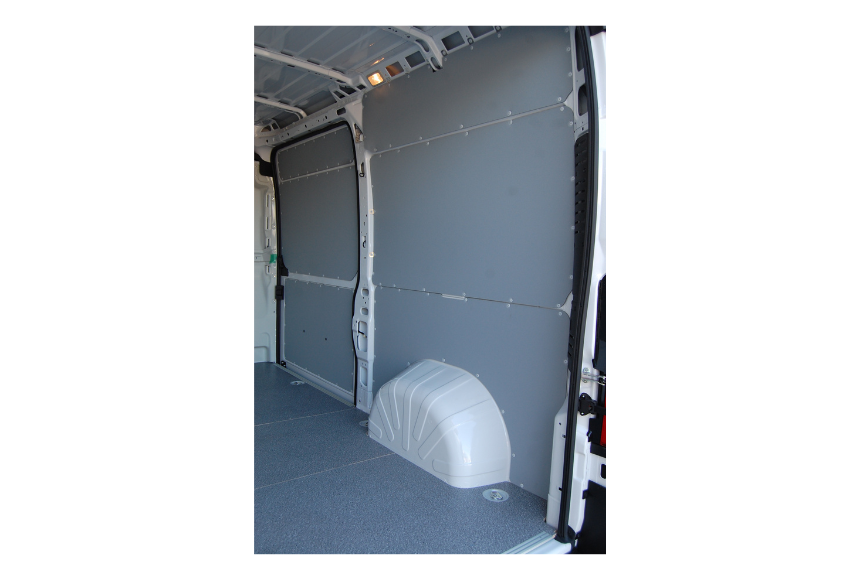 2. Pannellatura laterale, inclusi i retro porta e porta laterale, in polipropilene spessore 5 mm leggera, resistente agli urti e facile da pulire. Presenta una superficie goffrata di colore grigio chiaro.