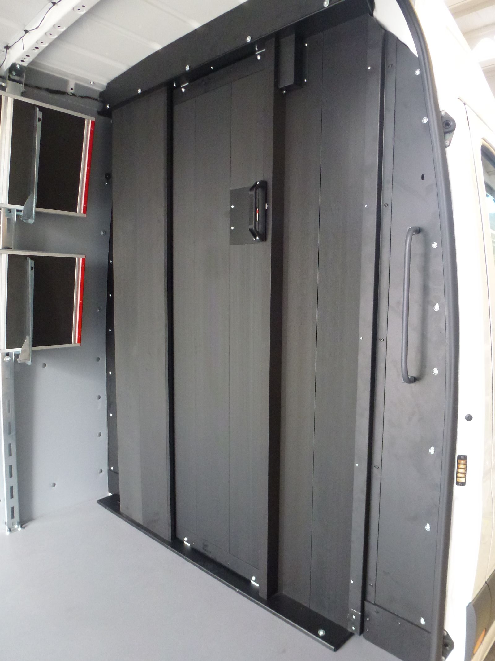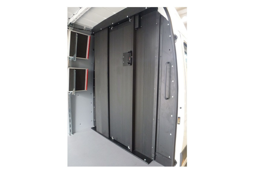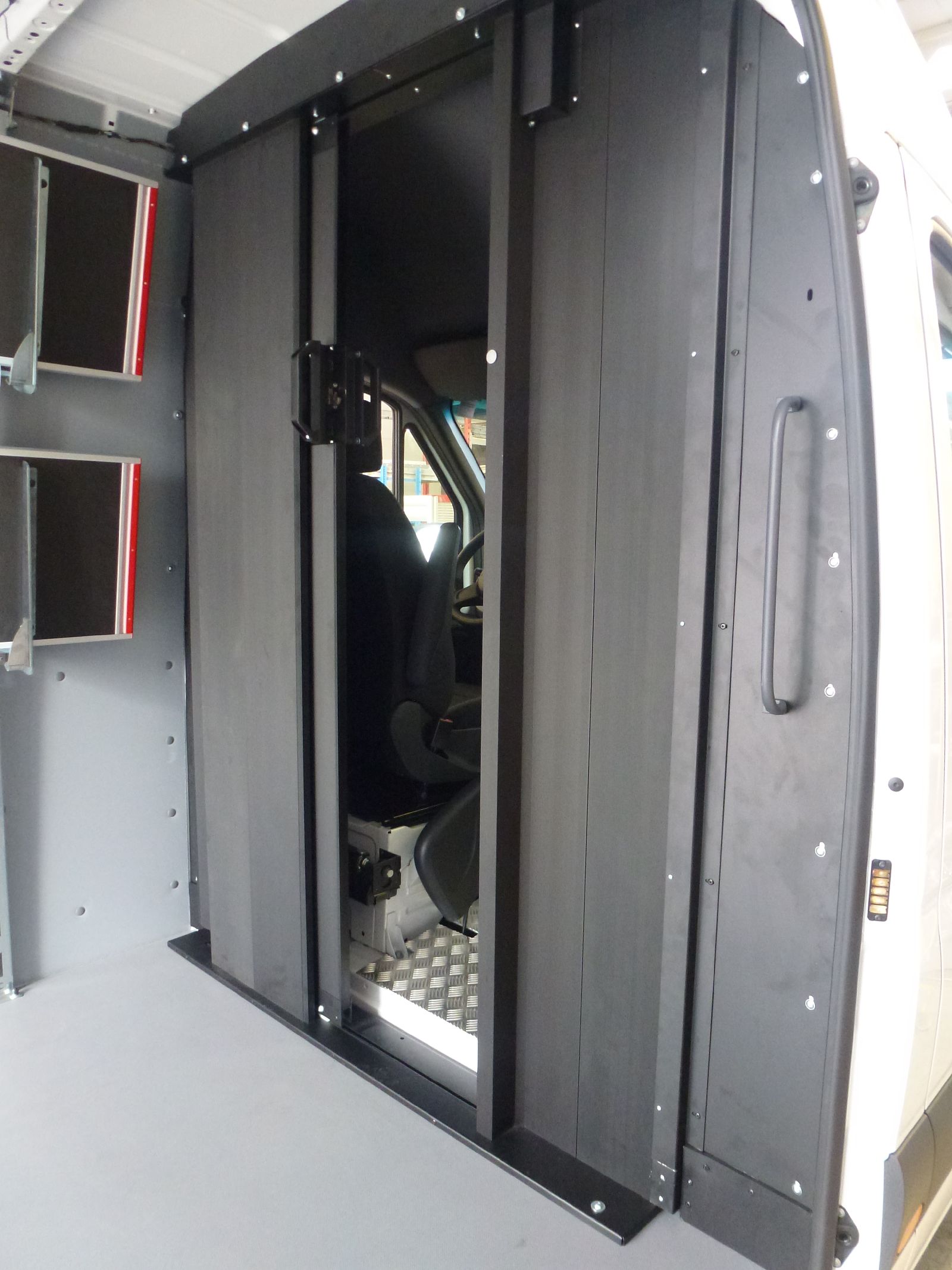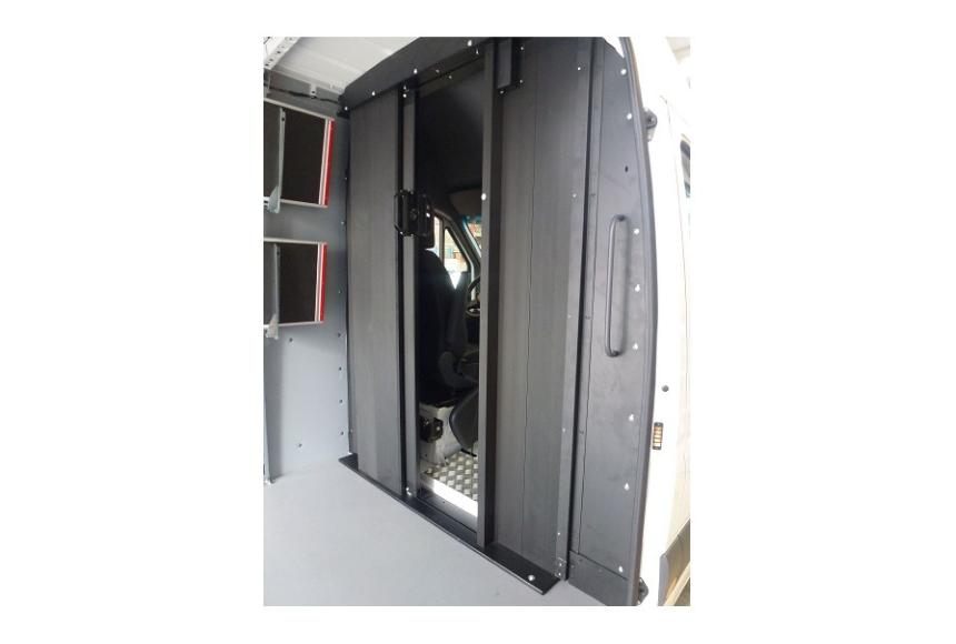 - Porta scorrevole in estruso di alluminio anodizzato, assicura gli stessi vantaggi della paratia fissa e garantisce assoluta silenziosità, eliminando qualsiasi vibrazione in percorrenza. Dalla cabina si accede al vano di carico aprendo la porta scorrevole della paratia con la stessa chiave di sicurezza dei lucchetti esterni, l’apertura della porta aziona la chiusura centralizzata del veicolo e attiva un alert acustico, obbligandone la chiusura una volta oltrepassata.