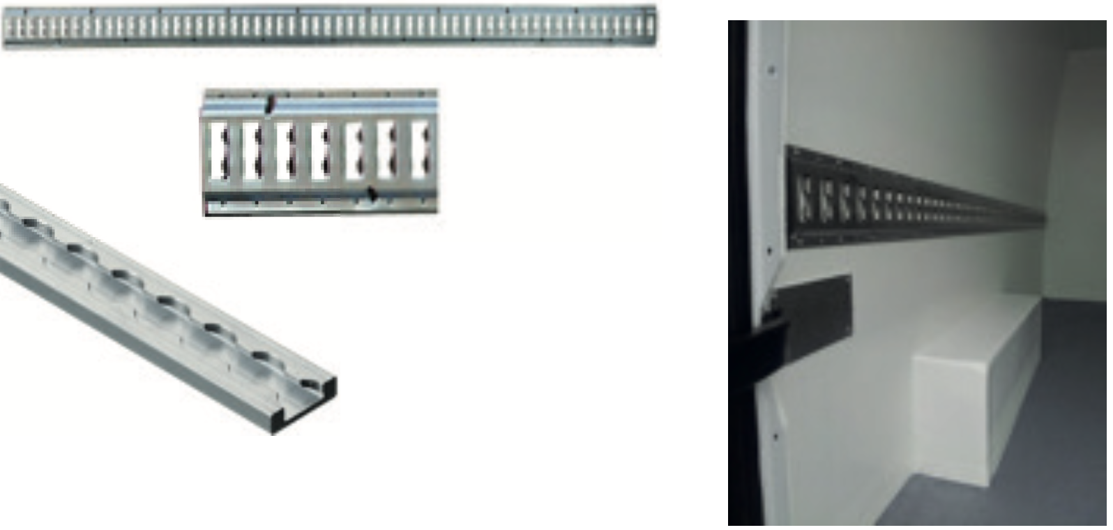 Cremagliera Barra in acciaio che permette l’inserimento delle cinghie per poter ancorare e dunque bloccare le merci durante il trasporto mediante apposite cinghie.